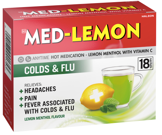 Med-Lemon Menthol Hot Medication 18 Sachets contains vitamin C and assist in treating colds and flu, headaches, pain and fever.