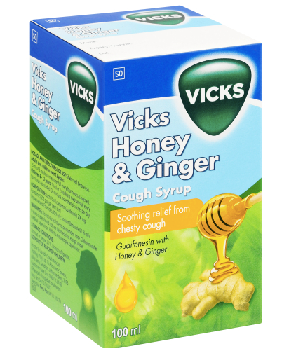 Vicks Cough Syrup Honey & Ginger 100ml combines the natural powers of guaifenesin with honey and ginger to soothe and offer relief from a chesty cough.